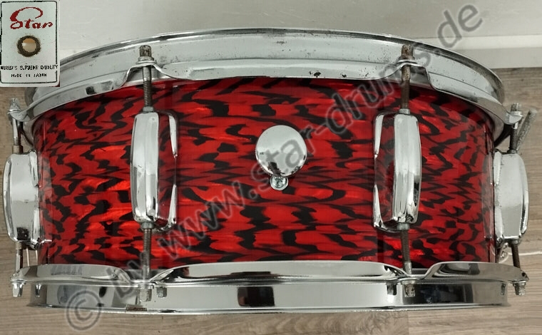 Star Snare Drum from the 60’s, in Red Satin Flame, in 14” x 5.0” (Mike, Boston, USA) Round/ silver Star badge Remarks: A wooden snare drum in a rare finish