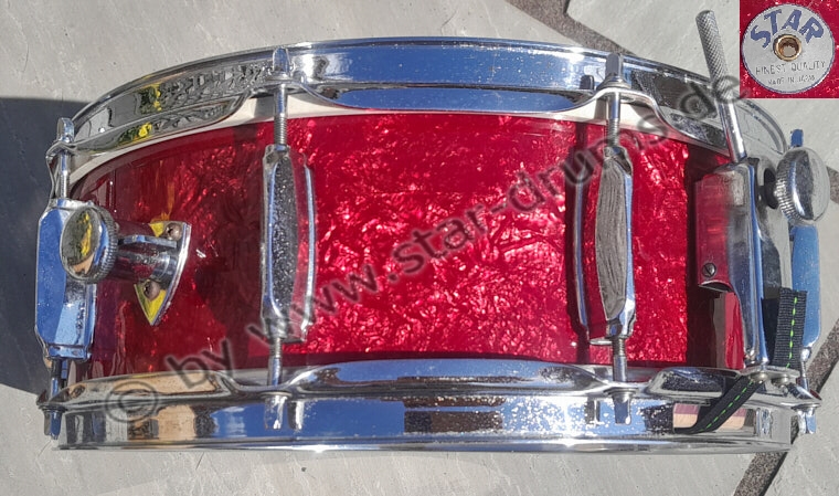 Star Snare Drum from the early 70’s, in Red (Sparkle) Pearl, 14”x 5.0” (Facundo, Miami, USA) Round/ silver Star badge Remarks: A nice wooden snare drum with the One-touch-tone-control damper (cannot be seen in this photo)